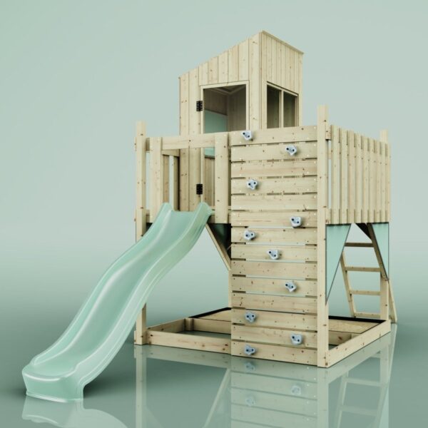 As well as the playhouse the raised platform has lots to explore and enjoy; to access the platform there is either the vertical climbing wall or wooden ladder at the rear. There is a large play area on the platform and the 8ft slide is the perfect way to reach the ground, plus space underneath to turn into a sandpit if you wish.