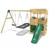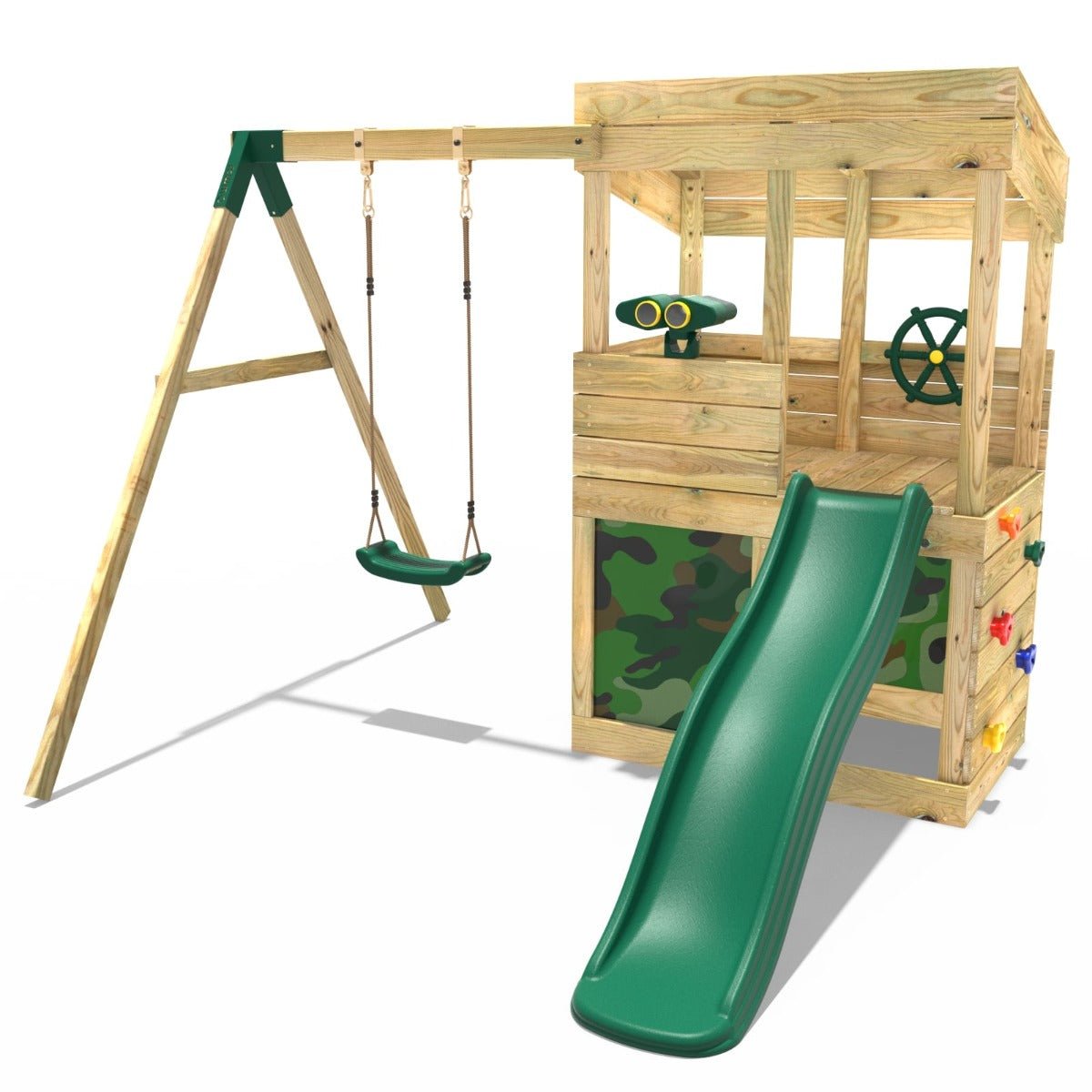 Made from pressure treated timber with an injection moulded 1.75m slide and swing arm this version comes with the Adventure pack included featuring Climbing Wall, Play Binoculars & Pirates Wheel and the Den Pack Canvas and Fixings